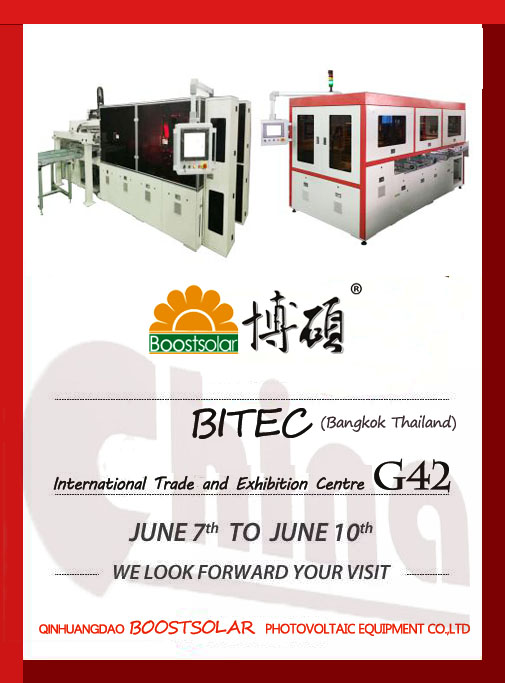 201767-610日,由知名主办方UBM Asia举办的第十二届泰国国际可再生能源展,在曼谷国际贸易展览中心举行。此展会为大家提供了较好的国际贸易交流与合作的平台。专业致力于光伏设备制造14年之久的企业----博硕光电,携公司新进研发的全自动汇流条焊接机、高速双轨BSSW-3600串焊机自动生产线设备
